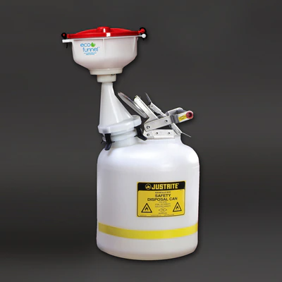 This 8" ECO Funnel® is designed to fit the large 3.65" opening on Justrite® Poly Waste Disposal Cans. This system includes a natural 5 gallon safety can. Our patented ECO Funnel features a latching lid with gasket to keep fumes contained. A removable large particle filter catches stir bars or other items.